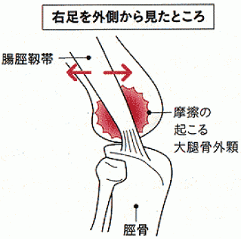 膝の屈伸運動を繰り返すことによって腸脛靱帯が大腿骨外顆とこすれて、炎症を起こします。