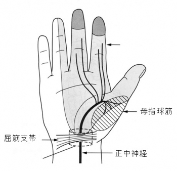 正中神経は手首部にある手根管という狭いトンネルを通り抜ける構造になっており、そのため、この部分で正中神経が圧迫されやすくなっています。