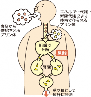尿酸の高い状態を高尿酸血症といい、痛風を引き起こすだけでなく、腎臓病や尿路結石につながるほか、高血圧や糖尿病、肥満などを合併しやすく、心臓病や脳卒中の危険因子にもなります。