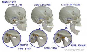 関節円板は、口を閉じている状態では、側頭骨の下顎窩と下顎骨の下顎頭に挟まれていますが、口を開けた時に、下顎頭と共に関節円板も前に移動し、亜脱臼をした状態になります。