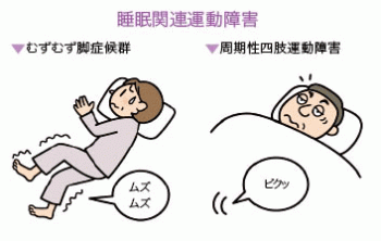 周期性四肢運動障害、むずむず脚症候群(レストレスレッグス症候群)が代表的な疾患で、しばしば両疾患は併存します。