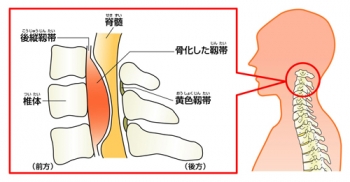 脊椎椎体後面を上下に走る後縦靱帯の骨化により、脊髄の通り道である脊柱管が狭くなり、神経が圧迫されて知覚障害や運動障害が症状として現れます。