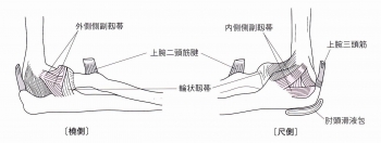 肘の靭帯は、内側側副靭帯、外側側副靭帯、橈骨輪状靭帯があります。