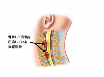 脊椎椎体後面を上下に走る後縦靱帯の骨化により、脊髄の通り道である脊柱管が狭くなり、神経が圧迫されて知覚障害や運動障害が症状として現れます。