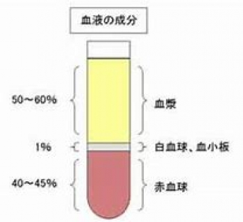 血液を試験管で遠心沈殿すると、下の方に赤血球の集まりでき、上の方に血漿が集まります。
