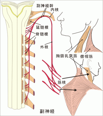 首を動かす筋肉、僧帽筋と胸鎖乳突筋に分布する運動性神経です。