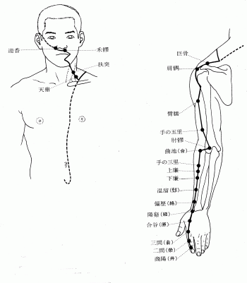 手の陽明大腸経とは、人差し指の橈側から始まり、上肢の外側を上り、鼻の外側で終わる 流注です