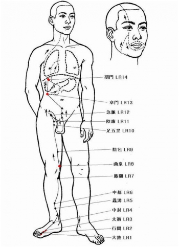 足の厥陰肝経は、足の第1指の外側から始まり、下肢の内側を上り、腹部で終わる、流注です。