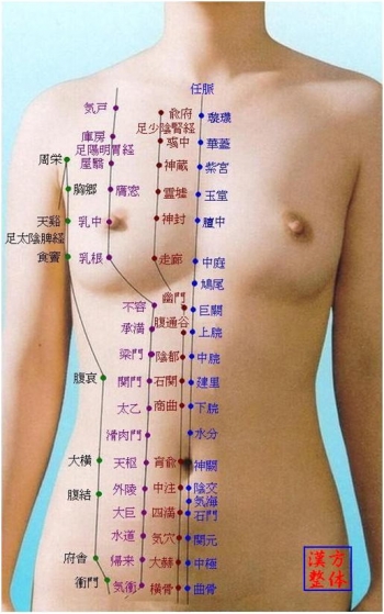 取穴部位:鎖骨下際、前正中線の外4寸、乳頭線上 胸部