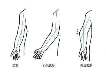 変形は、肘を曲げたときにはあまりはっきりしませんが、手のひらを上にして、肘を完全に伸ばすと正常な肘と比べるとはっきりします。