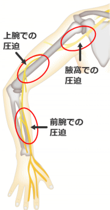 原因としては、外傷、上腕骨外果骨折、睡眠中に上腕を枕のかわりにして長時間寝る(うたたね)、ガングリオン、軟部腫瘍、脱臼などさまざまな原因となって発症します。