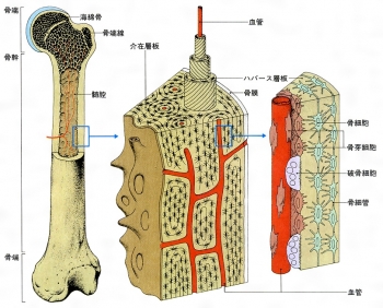 骨組織を形成する緻密室と海綿質があり、緻密室にはハバース管とフォルクマン管があり、この内部を血管が通っています。