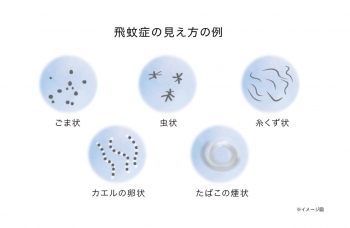 影の形は糸くず、雲、蚊、ハエ、アメーバ模様、輪状などさまざまで、大きさや色の濃さも原因や程度によって異なります。